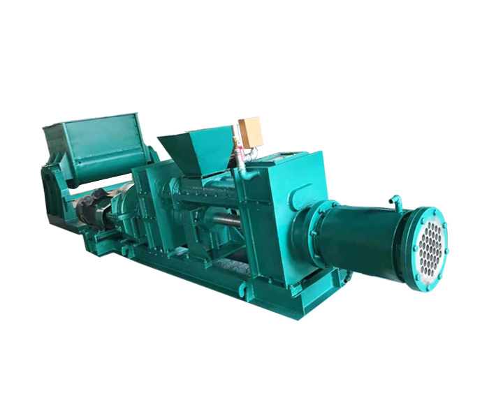 泥料從上軸加料口投入,通過攪拌,螺旋擠送,通過泥盤輸送到真空室,通過真空處理后由下軸輸送擠壓到各種不同形狀尺寸的擠出口,由松散變?yōu)橹旅艿膶?shí)心及空心產(chǎn)品。